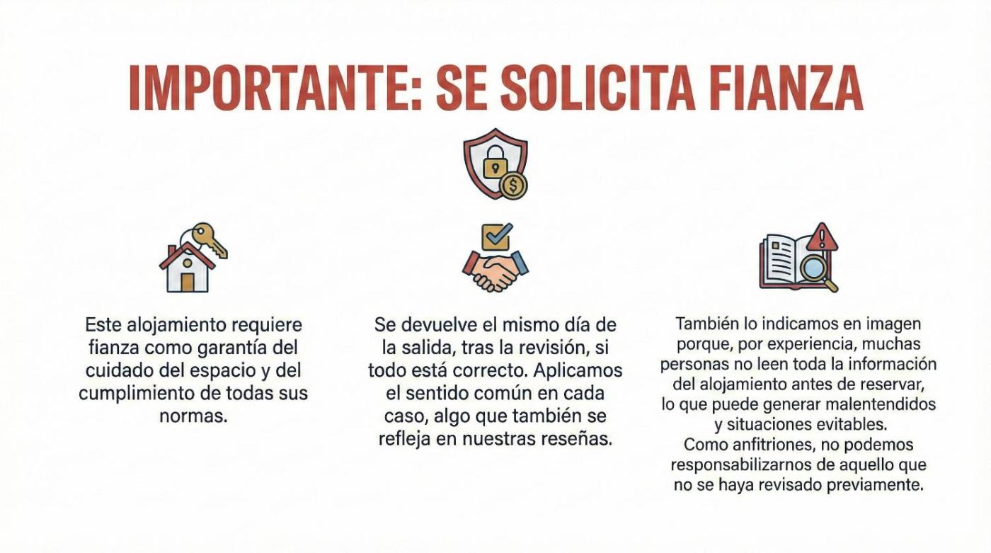 Una vez realizada la reserva, los huéspedes deberán abonar la fianza de 100 € y registrar a todos los viajeros a través del enlace que se os facilitará por mensajería en el momento de la reserva.