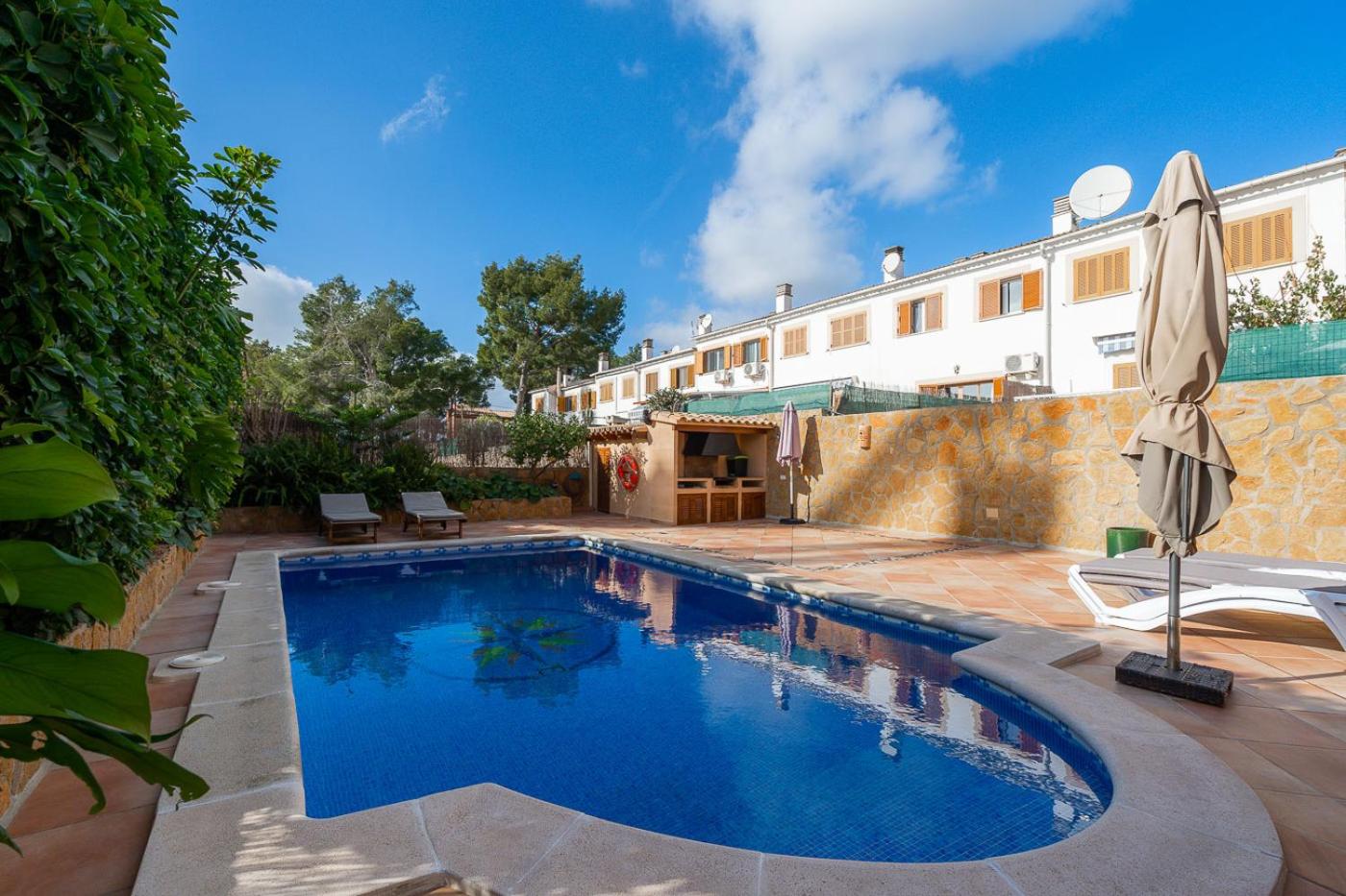 Guests can enjoy the outdoor swimming pool and garden at the villa.